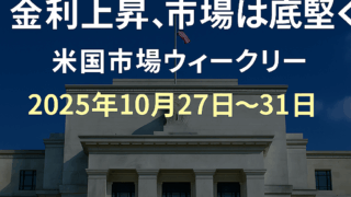投資 【米国株式市場 週間レビュー:2025年10月27日〜10月31日】利下げ観測の低下を業績で克服 FRBの慎重姿勢を受け金利は上昇、それでも米企業の収益が株価を支えた1週間。AI・量子コンピューター関連が新たな投資テーマとして注目。 2025.11.01 投資米国株式週間レビュー