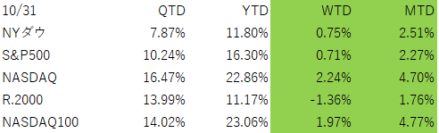 10月最終週の米国株式市場は、FRBのパウエル議長によるタカ派発言で一時調整する場面があったものの、企業決算の堅調さが支えとなり、週末には買い戻しが優勢となりました。