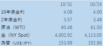 一方で、米10年国債利回りは4.08%台へ上昇。FRBのパウエル議長が「12月の利下げは既定路線ではない」と発言したことで、利下げ観測が後退し、金利先物市場では織り込みがほぼ100%から60%台へと低下。