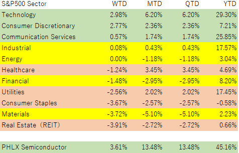 今週はテクノロジー、一般消費財サービス、コミュニケーションセクターなどのグロース系セクターが市場をけん引しました。