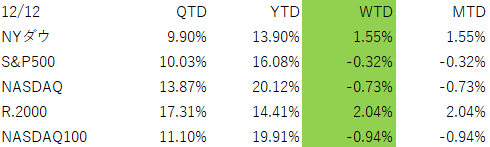 12月8日~12月12日のNY株式市場は、FOMCで予想通り利下げが行われ、ほっと一息をついて、NYダウ、S&P500、Russell2000などの指数が最高値を更新。しかし、その後、AIバブル懸念が再浮上し、週末に向けて軟調な展開となりました。