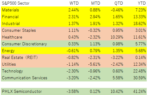 AIバブル懸念でグロース系セクター(テクノロジー、コミュニケーションなど)が不調でしたが、それでも、利下げの影響で、景気敏感系(黄色でハイライト)が好調でした。