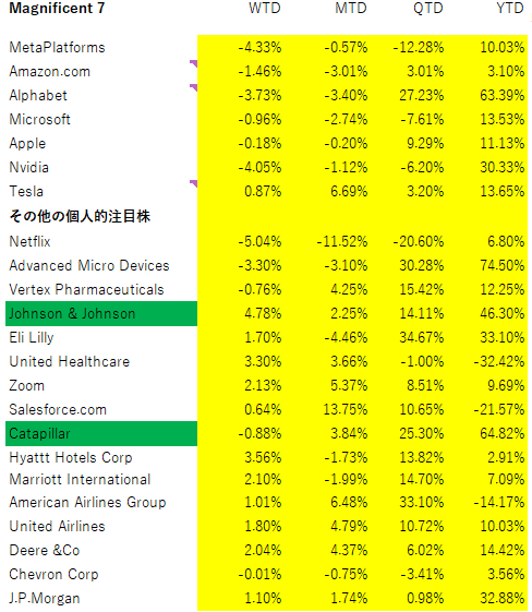 最高値圏で若干荒れている感じですが、この中で、薬品大手のジョンソンエンドジョンソン(JNJ)と建機・重機のキャタピラー(CAT)がAll Time Highと引け値ベースの最高値を更新しました。