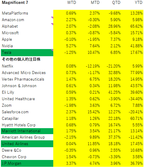 マリオット(MAR)、ユナイテッド航空(UAL)、JPモルガン(JPM)など景気の影響を受けやすい企業が大きく上昇しているのは、景気の底堅さを素直に受けたものと思います。