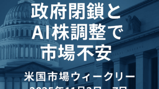 投資 【米国株式週間レビュー:11/3~11/7】連邦政府閉鎖とAIセクター調整で市場不安、週末は合意期待で下げ止まり 連邦政府の閉鎖長期化やAI関連株の調整が市場心理を冷やし、主要指数は下落。週末にかけて合意期待が高まり下げ止まりの動き。米国株投資家向けに今後の見通しを解説。 2025.11.08 投資米国株式週間レビュー