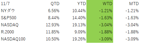 【米国株式週間レビュー:11/3~11/7】連邦政府閉鎖とAIセクター調整で市場不安、週末は合意期待で下げ止まり