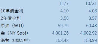 労働市場の弱さへの懸念 → 連邦政府閉鎖の影響で、10月の雇用統計がまだ発表されていません。金融政策が手探り状態になっている中で、雇用が比較的強いことが、金利が高止まりしても米国経済は大丈夫という信念が、市場を支えてきました。(不安を抱えつつも)それが、民間の雇用関連の指標で、揺らいできています。