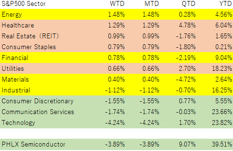 グロース系セクターが不振の一方で、ディフェンシブ系のセクターが堅調でした。指数全体が下落している中で、セクターでマイナスになったのが、製造業(Industrial)とグロース系の一般消費財サービス、コミュニケーション、テクノロジーだけです。