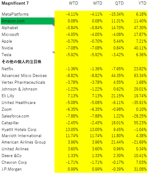 この週では、週初にアマゾン(AMZN)がAll Time Highと引け値ベースの最高値を更新しています。マグニフィセント7では、唯一プラスで終わった銘柄です。