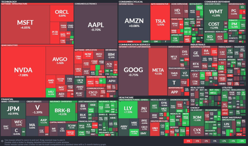 面積としては半導体などを含むテクノロジーは真っ赤っか(大きく下げた)。緑(上昇)の銘柄も結構見えています。