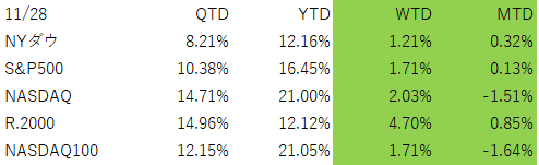 【米国株式週間レビュー:11月24日~11月28日】静かにクリスマスラリーがスタート?