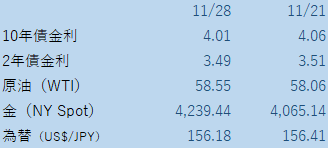 11月24日~28日の週は、27日が感謝祭であり、かつ28日が午後1時で取引が終了するEarly Closeであったため、市場参加者も減り、金利低下観測も徐々に強まり、落ち着きを取り戻した週でした。