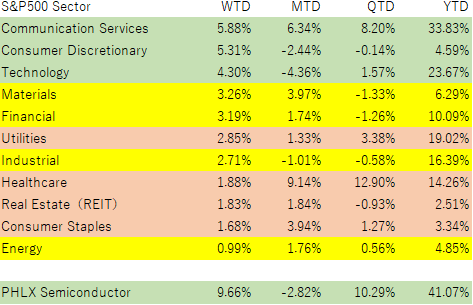 今週の上昇をけん引したのは、はっきりとグロースセクター、即ちテクノロジー関連とコミュニケーション・サービス(ネット・プラットフォーム等)、そして一般消費財サービスでした