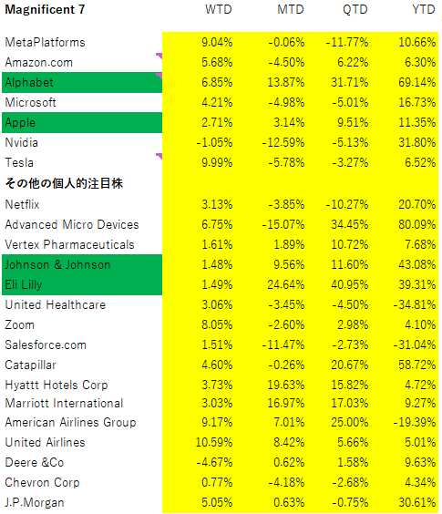 グリーンではいらいとしたアルファベット(GOOGL)、アップル(AAPL)、ジョンソンエンドジョンソン(JNJ)、イーライ・リリー(LLY)は、All Time Highと引け値ベースの最高値を更新しました。