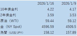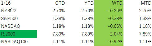 この週(1/12~1/16)のNY株式市場は、高値圏で次の動きの契機を探るような展開の中で、年初来の小型株(Russell2000)優勢の状況が継続しています。