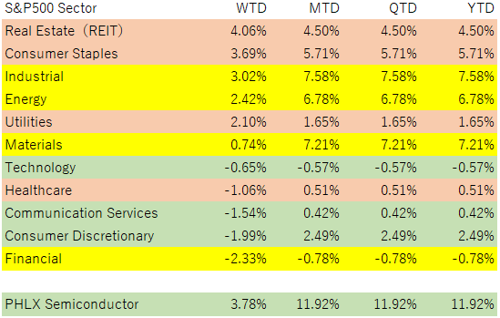セクターの特徴的な動きは下のヒートマップで明らかです。(Finvizのヒートマップです。1週間の動きです)