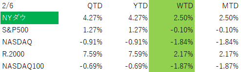 2/6(金)は日中で S&P500が+2.0%、NASDAQが+2.2%、Russell2000が+3.6%、ダウが+2.5% と強烈な反発。