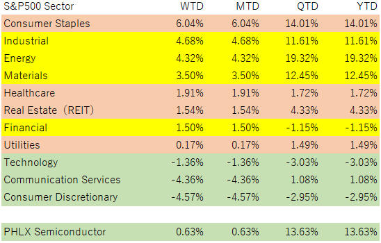 比較的綺麗に、シクリカル(景気敏感系)が優勢、そしてグロース(成長系)セクターが軟調で、ディフェンシブ(非景気敏感系)がその中間という構図が綺麗に形成されました。