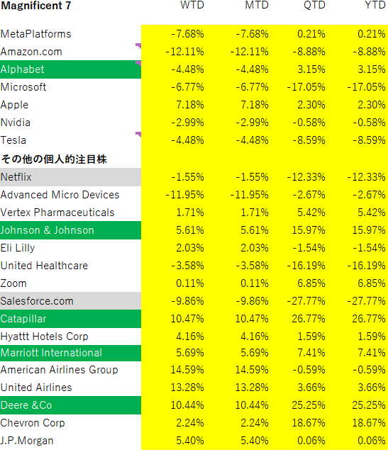 その反対で、そうした巨額投資が続くとのことで、NVDAやAMDなどは大きく反転しています。(とはいえ、週間ベースではマイナスですが)
