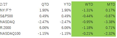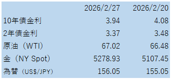 ドル指数(DXY):2/20→2/27で小幅に低下(概ね横ばい圏)。