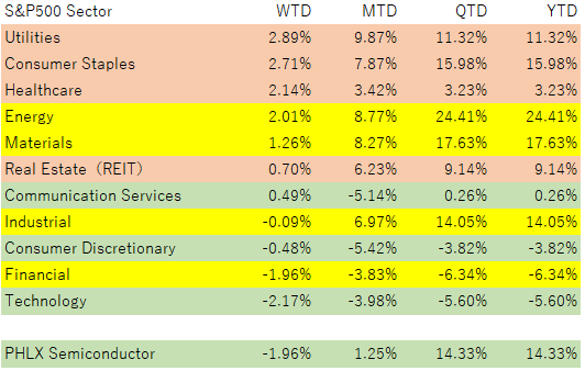 週末にかけての下げ局面では、物色は明確に「守り」に寄りました。ロイターは、ヘルスケア/消費必需品/公益などのディフェンシブが相対的にしっかりし、逆に金融とテックが弱かったと報じています。