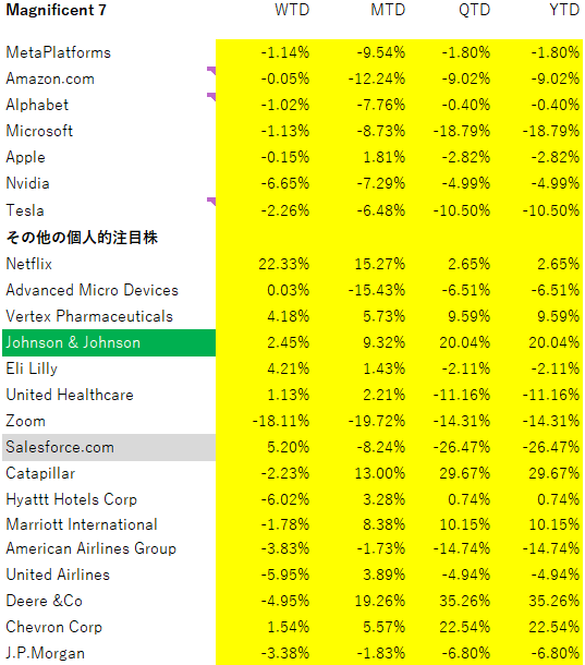 この週に引き続きAll Time Highと引け値ベースの最高値を更新したのは、薬品大手のジョンソンエンドジョンソン(JNJ)でした。市場のグロース株からディフェンシブへのシフトも手伝って最高値更新中です。