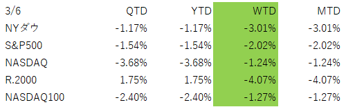 今週(3/2-3/6)の米国株市場は、かなり明確なリスクオフ週となりました。
