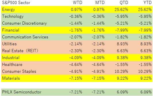 今週のセクター物色はかなりわかりやすく、エネルギーが相対優位、逆に金融、消費関連、旅行関連、小型株が弱い週でした。