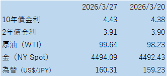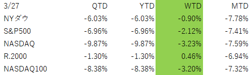 この週(3/23ー27)、米国株式市場はイラン戦争長期化懸念で引き続き下落し、金曜日時点でNYダウ、NASDAQ、NASDAQ100は直近の高値から10%以上下落し、調整局面入りとなっています。