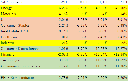原油価格高騰などを受けてエネルギーやマテリアルが大きく勝ち、ディフェンシブが相対的に強く、グロース系は金利上昇などの影響も強く相対的に軟調と、特性がはっきり出た週でした。