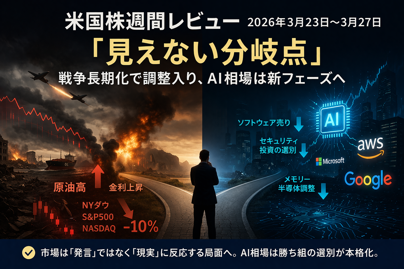 この週(3/23ー27)、米国株式市場はイラン戦争長期化懸念で引き続き下落し、金曜日時点でNYダウ、NASDAQ、NASDAQ100は直近の高値から10%以上下落し、調整局面入りとなっています。