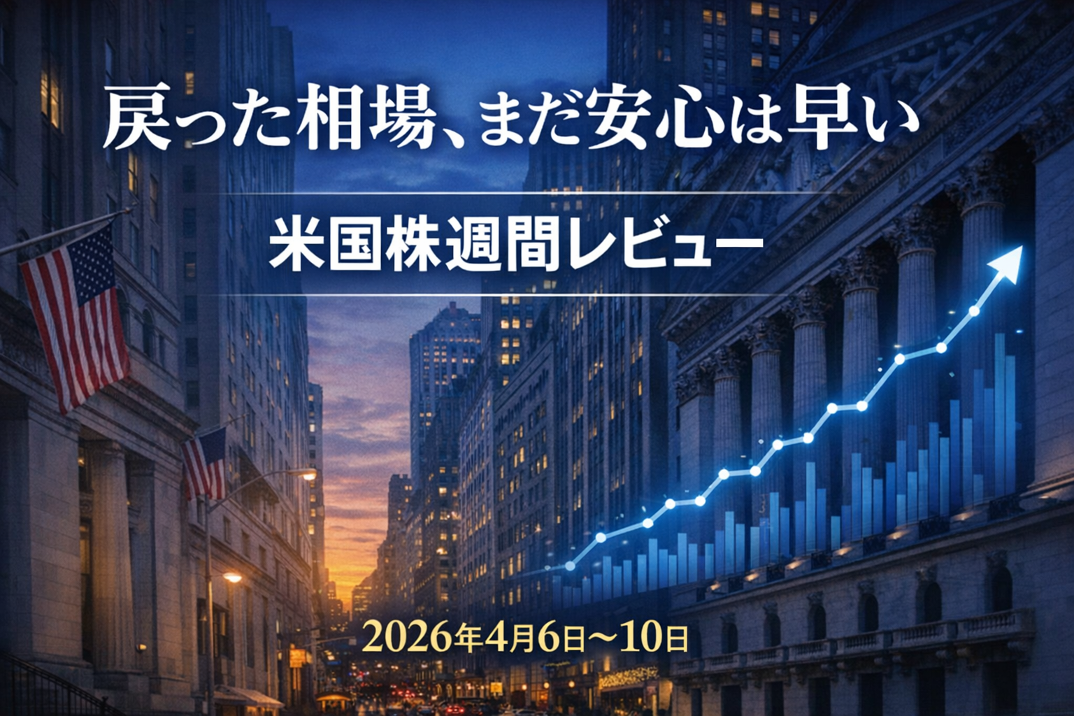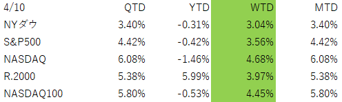 4月6日から10日の米国株市場は、大きな意味で「中東リスクの巻き戻し」が主役の1週間でした。週末時点で、NYダウは週間で約3.0%上昇、S&P500は約3.6%上昇、NASDAQは約4.7%上昇、Russell2000も約4.0%上昇しました。