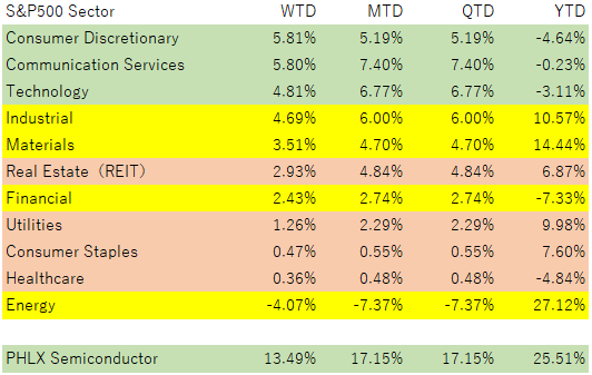 週前半の大幅上昇局面では、エネルギーを除くほぼ全セクターが上昇し、特に工業、金融、一般消費財、情報技術など景気敏感・リスク選好系のセクターが強く買われました。逆に原油急落を受け、エネルギー株は相対的に弱くなりました。