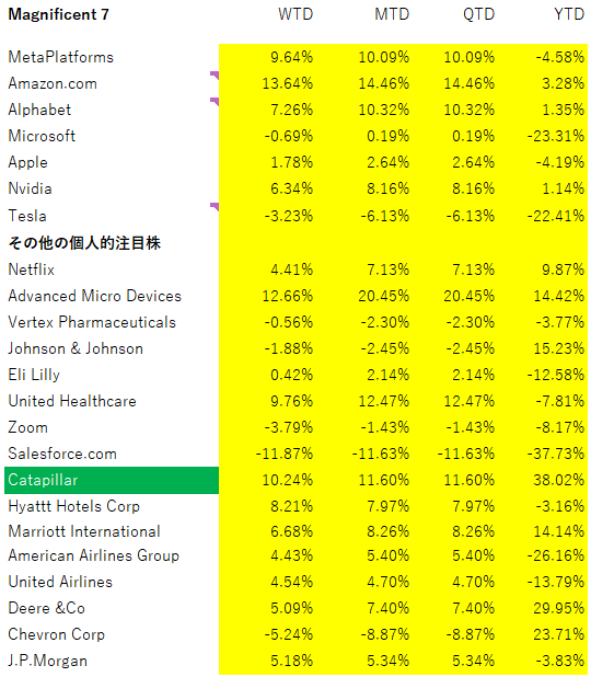 グリーンでハイライトした重機・建機のキャタピラー(CAT)が市場反転上昇の中で大きく買われ、All Time Highと引け値ベースの最高値を更新しています。