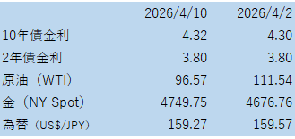 まず3月の米CPIは前月比0.9%、前年比3.3%と加速し、ガソリン価格の急騰が主因でした。一方で、食品とエネルギーを除いたコアCPIは市場予想より穏やかで、株式市場は「インフレは悪いが、最悪ではない」と受け止めました。10年債利回りは4.3%前後に上昇し、FRBの早期利下げ期待はやや後退しています。